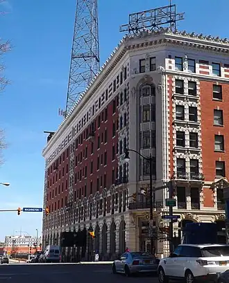The original building was designed by the firm of Bethune, Bethune & Fuchs and built between 1902 and 1911. Additions from 1916–1917 and 1924–1926 were completed by Esenwein and Johnson. The lobby was decorated in 1942 in the Art Moderne style.[2] In its prime, the Lafayette Hotel was considered one of the 15 finest hotels in the country. Besides elevators, every room featured hot and cold water and a telephone. A 97 m (318 ft) antenna is attached to the building. From September 29 to December 19, 1953 it was home to the short-lived television station WBES-TV.