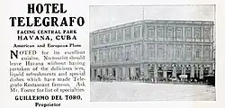 In 1892, it was managed by Gonzalez & Giralt, Proprietors. In 1893, the Souvenir of the Grand Hotel Telégrafo was published by J.C. Prince.[3] Other Hotel Telegrafo locations existed in Sagua La Grande and Camajuaní.[4]