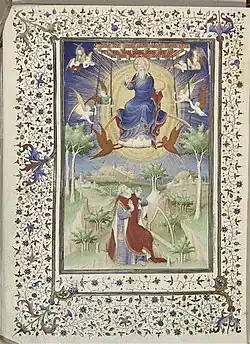 The Boucicaut master most likely discovered aerial perspective as witnessed by his mastery of it in this book of hours.[1] Master Boucicaut was interested in bright colors and their roles in creating expression and meaning in static forms.[1] In other words, he used bright colors to imply a certain mood. The artist concentrates on creating grouped forms that seem to have their own independent importance.[1] He paints the forms in a way that seems like the individual could be displaced from the group and still have context.[1] Through his composition Master Boucicaut introduces the concept of depicting biblical scenes as earthly events.[1] In the scenes Flight into Egypt[3] and Pentecost,[4] a shepherd off in the distance with his flock places the foreground scene in the context of the real world.[1] This implies the foreground event is in "reality" rather than a purely celestial moment.