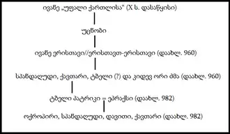 In the tenth century Tbelis were one of the powerful feudals in Kartli. Their fiefdom was centered in Liakhvi gorge (villages: Tbeti, Eredvi, Nikozi, Bortsvisjvari, Dodoti etc.). Bortsvisjvari Church near Tskhinvali, gives rich information about the Tbelis.[1][2] From the content of the inscriptions it can be found out that Tskhinvali and its surroundings was the domain of the Tbelis. Inscriptions of the Dodoti Tskhrakari Church says that it was built by the local feudal lord, Ivane Tbeli and his son Kavtar Tbeli.[3] On the inscriptions of Eredvi Basilica Ivane's name is mentioned among sovereigns of Kartli, while in Dodoti Tskhrakara church, he is mentioned as Eristavi (duke), where he was probably appointed by the George II of Abkhazia, who later would his son Constantine as Eristavi of Kartli, but the latter engineered a coup against his father three years later, where Tbelis (perhaps Ivane and his five sons) took part and were defeated. The rebels were punished and expelled from Kartli to Vaspurakan. In the tenth century aristocratic opposition of Kartli led by Kavtar Tbeli revolted against Bagrat III of Georgia and ran their fiefdoms as semi-independent rulers. When Bagrat returned to Kartli to deal with this situation, the nobles offered him an armed resistance, but the king won the battle at Moghrisi in 982, and forced the rebels into submission.