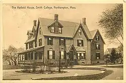 Laurenus Clark Seelye, Smith's first president, hoped that by keeping students in homes with a cultured matron keeping an eye on them that they could gain an education while keeping within the bounds of Victorian femininity. Sarah W. Humphrey was the first matron of Dewey House, charged with ensuring the students would not overstrain themselves in their studies.[1] In 1877–1879, Smith constructed its first purpose built dorms, all keeping in the style of domestic Victorian architecture, Hatfield, Washburn, and Hubbard Houses, all designed by Peabody & Stearns.