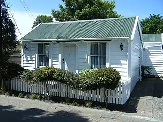 Houses from this period are divided into cottages and villas. The first houses built in New Zealand were cottages.[20] Villas were the larger and more expensively built equivalent. The typical villa has the kitchen to the rear of the house and separate from the dining room, as food preparation was meant to occur out of sight.[21] Villas were the main form of housing in residential areas from after 1840 up to World War I.[22]