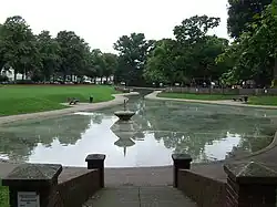 The more informal Park has a large green space, a play area, a paddling pool opened in 1930, a refreshment kiosk and public toilets. East of the paddling pool is a memorial to Ebenezer Howard: a stone tablet installed in 1930, flanked by curved brick screen walls.[1][3] In the south-west corner of the Park is the Mrs Howard Memorial Hall. It was designed by Barry Parker and Raymond Unwin, and was built in 1905–1906, the first public building in the new town. It is a Grade II listed building, and is described in the listing as a smaller scale version of the Church of Christ, Scientist in Manchester (now the Edgar Wood Centre).[1][4]