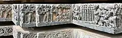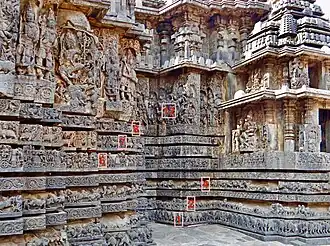 The temple outer walls is intricately carved. Its lowest layers consist of bands with friezes that consist of (from bottom to top) elephants, lions, scrolls with nature and miniature dancers, horses, scrolls, scenes from Hindu texts,[10] mythical beasts (makara) and swans.[35][36][37] According to Shadakshari Settar, the artwork shows details as "no two lions are alike in the entire span that covers more than a furlong (200 metres)", the artists "captured the Ramayana and the Mahabharata, and the main episodes of the Bhagavata". The temple's outer wall is a pictorial narration of Hindu epics, and its middle portion has large panels where "the entire pantheon of Hindu divinities are presented, it is a manual of Hindu iconography", states Settar.[36] According to Foekema and other art historians, the quality and quantity of the epics-related "friezes are amazing", but the panel series do not complete the story in a stretch, rather after a stretch, another text is intermingled in for a while.[38][39] The outer walls of the Hoysaleswara temple shrines feature 340 large reliefs.[40]