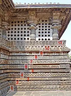 Artwork on the outer walls of the temple are in bands. 1: marching playful elephants; 2: lions; 3: thin miniature scroll; 4: horsemen in different postures; 5: thin miniature scroll; 6: friezes narrating legends from the Hindu texts; 7: makaras; 8: hamsa and peacocks; 9: professionals, daily life of people alternately standing and sitting; 10: mythical creatures, festivals, ceremonies; 11: artha, kama, dharma scenes including courtship and mithuna (eroticism, sex), various occupations, some mythical scenes; 12: large image panels (deities, spiritual stories from Hindu texts).[34][35]