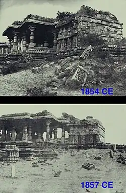 The Hoysalesvara temple was one of the first to be properly surveyed in Karnataka between 1801 and 1806. After the invention of photography, it was one of the earliest to be photographed in British India. These show neglect and scattered ruins.[15]
