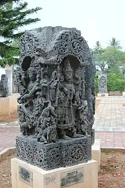 The Hoysaleswara Temple premises include a museum managed by the Archaeological Survey of India. It contains numerous pieces of ruins and temple artwork recovered from the site for closer three dimensional examination. The temple premises also has the so-called Garuda Sthamba (Garuda pillar) to the south of the temple. It is also damaged, with its top portion gone.[59] It contains an inscription that breaks off in the middle of the sentence. The part which can be read states that a general Lakshmana, his wife and followers sacrificed themselves after the death of Ballala II. In the middle of the pillar are eight male figures, four of whom are shown as using their swords to sacrifice themselves (siditale-godu).[59] One of the sacrificer is shown seated in a namaste posture preparing for the sacrifice, while others are shown in the process of the sacrifice. The images represent the devotion of these to their leader and their determination to die with him.[59]