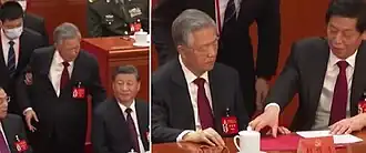 On October 22, 2022, Hu Jintao, former General Secretary of the Chinese Communist Party (2002–2012), was escorted out of the hall at the closing ceremony of the 20th National Congress of the Chinese Communist Party. He was pulled from his seat by two men following the incumbent General Secretary Xi Jinping's instructions.[1][2][3] As media from across the world had entered the venue at the time of the incident, it quickly became the focus of international coverage.[4][5][6]