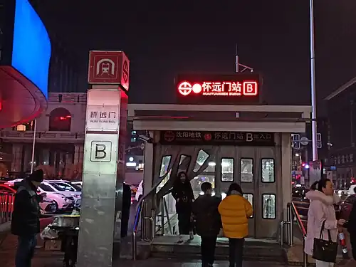 Huaiyuanmen (Chinese: 怀远门站; pinyin: Huáiyuǎnmén Zhàn) is a station on Line 1 of the Shenyang Metro.[1] The station opened on 27 September 2010.[2]