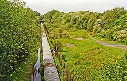 Hugglescote railway station is a disused railway station on the former Ashby and Nuneaton Joint Railway. It served the large village of Hugglescote where it joined the Leicester - Burton line and Charnwood Forest Railway. It closed in 1931[2] to passengers but closed to parcel traffic in 1951. Goods continued to pass through until 1965 when the line was closed from Coalville to Shackerstone. The site has since been demolished and is now overgrown. It was briefly used for a conveyor but this has since been removed. The photograph shows the site of the station yard, the station was immediately behind this point of view.