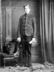 In 1889, when he was 16 years old, his father, who had become a solicitor, was declared bankrupt. After initially being removed from Hill Lands,[8] the young Trenchard was only able to return thanks to the charity of his relatives.[4] He subsequently failed the Woolwich examinations twice and was then relegated to applying for the Militia which had lower entry standards. Even the Militia's examinations proved difficult for Trenchard, and he failed in 1891 and 1892. During this period he underwent a period of training as a probationary subaltern with the Forfar and Kincardine Artillery. Following his return to Pritchard's, he achieved a bare pass in March 1893. At the age of 20, he was gazetted as a second-lieutenant in the Second Battalion of the Royal Scots Fusiliers and posted to India.[12]