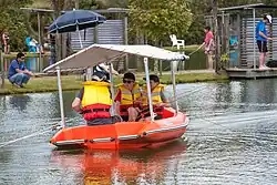 The park offers activities such as prawn fishing, guided tours of the park, and an activity loop with a number of interactive water features.[3] Visitors can make use of stand up paddle boards, pedal boats and an aqua trike to pedal over a pond full of prawns. Huka Prawn Park has become one of the major draw-cards for tourists to the Taupō region. It now has more than 75,000 visitors a year, with a large number of Chinese among the international visitors.[4] It uses a mascot, Shawn the Prawn, for marketing purposes. Shawn the Prawn often visits his guest on school and public holidays.