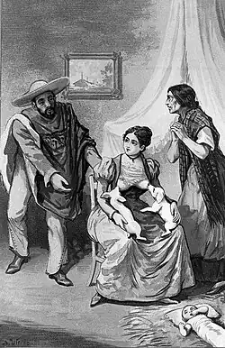 A woman breast feeding two puppies while two Mexican peasants implore her to feed their baby.