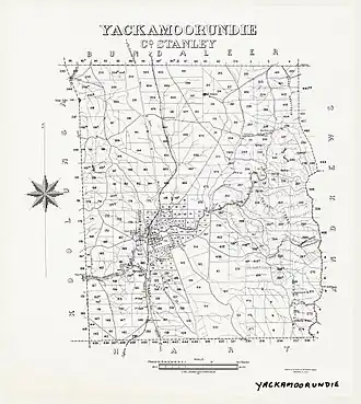 The main town of the hundred is Yacka, which was named after the hundred, the hundred in turn being named after Yackamoorundie Creek.[1] The bounded locality of Gulnare, which overlaps the hundred's northern border is the only other town or locality within the hundred. Rising north of Caltowie in the Hundred of Caltowie, the Yackamoorundie Creek, a tributary of the Rocky River, flows briefly through the hundred near Gulnare, at which point it makes a significant change from flowing southwards to flowing westwards.