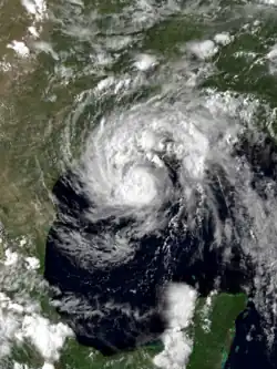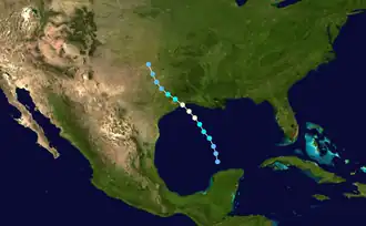 Almost immediately after emerging into the Gulf of Mexico on July 30, the cloud pattern of system quickly became better organized. Later after emerging into the Gulf of Mexico, ships and satellite images confirmed that Tropical Depression Four had formed offshore of the north coast of the Yucatán Peninsula; although it was likely that the depression formed 80 miles (130 km) north of the Yucatán Peninsula several hours earlier than confirmed.[2][3] The following morning after development occurred, the depression had intensified into a tropical storm 575 miles (925 km) southeast of Texas; the National Hurricane Center assigned it to the name Chantal.[2] Although it became a tropical storm early that morning, the system was not upgraded to a tropical storm until a reconnaissance flight confirmed tropical storm force winds about six hours later, when sustained winds were already 50 mph (80 km/h). Tropical Storm Chantal rapidly strengthened thereafter, with weather satellites indicating t–numbers increasing from 2.5 to 3.5 within twelve hours using the Dvorak technique. Chantal continued to intensify, and headed northwestward at 11 mph (18 km/h) due to weak ridging over Florida.[4]