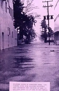 In Miami-Dade County (then Dade County), thousands of low-lying homes in the Homestead area were flooded.[31] The storm also overturned 25 mobile homes and caused one death in the city. While telephone service remained mostly uninterrupted, approximately 152,000 people lost electricity.[32] Donna was the first hurricane to affect Miami, Florida, since Hurricane King in October 1950.[31] Although structural damage in and around Miami was generally light, winds shattered windows and uprooted trees. Heavy precipitation inundated streets.[32] Overall, 857 houses in Dade County were destroyed, while about 2,317 others suffered damage. Significant agricultural losses were also reported.[31] About 100 homes in Broward County reported minor damage.[33] In Boca Raton and Delray Beach, damage was mostly limited to downed billboard signs and shattered windows.[34]: 6 Boynton Beach observed wind gusts up to 70 mph (110 km/h) at the inlet.[34]: 1 Storm surge covered State Road A1A with mud and sand.[34]: 6 In North Palm Beach, winds shattered a few windows and destroyed a shopping center sign.[34]: 1 A fire destroyed a cocktail lounge in Juno Beach after response teams were unable to extinguish the blaze due to high winds.[35]