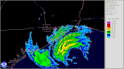 Despite tracking back over water, Ike's prolonged interaction with Cuba had greatly disrupted the system's core, and instead of quickly strengthening and coalescing, the storm's wind field instead grew and only gradual intensification ensued.[18] Due to the storm's comparatively small inner core and intensity of the outer rainbands,[22] an eyewall replacement cycle took place, preventing Ike from rapidly intensifying. At around the same time, a high-pressure area strengthened to the hurricane's north, steering the cyclone further west than initially anticipated. Moving over the warm waters of the Loop Current,[18] Ike reached a secondary minimum in barometric pressure on 00:00 UTC with an estimate of 944 mbar (27.9 inHg); though winds would continue to strengthen afterward, the storm's pressure would rise.[23] By late on September 12, Ike had reached the western edge of the nearby high-pressure area and began to curve northward. The formation of an eye just prior to landfall resulted in a slight increase in winds,[18] and at 0700 UTC on September 13, Ike made landfall on the northeast end of Galveston Island in Texas, with a minimum barometric pressure of 950 mbar (28 inHg) and sustained winds of 110 mph (180 km/h), making Ike a Category 2 hurricane.[23] After tracking inland, Ike weakened as it sped northward and later northeastward, weakening to tropical storm status east of Palestine, Texas late on September 13 and later becoming a powerful extratropical cyclone on September 14 over the Ozarks.[18] A more steady weakening phase ensued, and after tracking across southern Ontario and Quebec, the remnants of Ike were absorbed by another extratropical low near the St. Lawrence River, on September 15.[24]