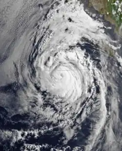 After remaining a marginal tropical storm for 18 hours, Ismael began to deepen and by August 10, it was approaching hurricane intensity.[3] By this time, the storm was forecast to accelerate and approach Guadalupe Island in three days.[2] At 1800 UTC on August 10, Ismael was upgraded into a hurricane. At 0245 UTC the next day, an eye began to form as the system passed east of the outer Revillagigedo Islands.[1] Nine hours later, the EPHC upgraded the storm into a Category 2 hurricane on the Saffir-Simpson Hurricane Wind Scale (SSHWS); simultaneously, the storm reached its peak of 100 mph (160 km/h). At the time of its peak, Hurricane Ismael was located about 400 mi (640 km) west of Cabo San Lucas.[3] Sandwiched between a ridge to the west of the hurricane and a trough off the coast of California, Ismael turned west-northwest and accelerated.[1]