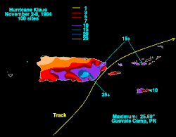While moving past Puerto Rico, Tropical Storm Klaus dropped heavy rainfall peaking at 25.69 inches (653 mm) in Guavate Camp in the southeastern part of the island. Much of the southern half of Puerto Rico reported over 7 inches (180 mm) (178 mm). Vieques received around 7 inches of precipitation, while Culebra experienced over 10 inches (250 mm).[5] The heavy rainfall resulted in freshwater flooding.[4] The strongest winds of the storm remained offshore, and wind gusts peaked at 37 miles per hour (60 km/h) in Roosevelt Roads Naval Station. Winds and rainfall on the island resulted in downed trees and power lines, though damage was minimal. Klaus struck the island on election day, causing slight disruptions to the process.[6]
