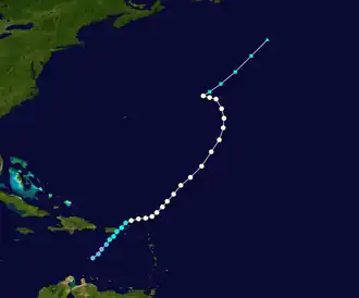 Tropical Storm Klaus continued northeastward, and made landfall on extreme eastern Puerto Rico early on November 7. The storm passed a short distance north of the Lesser Antilles,[1] and became the first tropical cyclone in recorded history to affect the islands from the west.[2] Favorable conditions allowed the storm to continue strengthening, and Klaus attained hurricane status early on November 8. The hurricane accelerated to the northeast, and reached its peak intensity of 90 mph (145 km/h) late on November 8. After maintaining its peak strength for 30 hours, Klaus weakened slightly.[1] Interaction with an upper-level low turned the hurricane westward on November 11, though an approaching trough of low pressure turned Hurricane Klaus to the northeast. Cold air and cooler waters weakened the convection around the center on November 12, and Klaus degenerated to a subtropical storm. It accelerated to the northeast and degenerated to an extratropical storm on November 13 while located about 440 miles (700 km) south-southeast of Cape Race, Newfoundland.[3] Six hours later, it was absorbed by another extratropical system.[4]