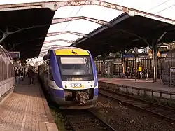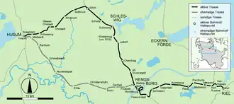 The Husum–Kiel railway is a main line railway in the German state of Schleswig-Holstein. While the central section of the line, which is shared with the Neumünster–Flensburg line, has two tracks and is electrified, its western and eastern sections are single track and are not electrified. It connects the cities of Husum and Kiel via Rendsburg and serves as an important east-west rail axis between the North Sea and the Baltic Sea.