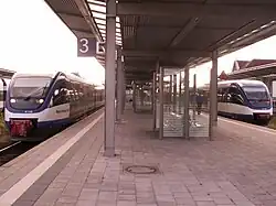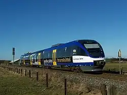 Since January 2015, in addition to the hourly Regional-Express service, a Regionalbahn service runs hourly between Kiel and Rendsburg, which also stops in Kiel-Hassee CITTI-PARK, Kiel-Russee, Melsdorf, Achterwehr, Bredenbek and Schülldorf.[4] These stations were reactivated with the exception of the new Kiel-Hassee CITTI-PARK station and the Bredenbek station which was relocated from Kronsburg. The dismantled second track from Kronsburg was rebuilt at the new station to increase the line's capacity.[5][6] Only individual Regionalbahn services operate to Schleswig or Husum. The least frequented stations of Kiel-Russee and Achterwehr are request stops.