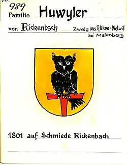 Huwyler is a topographic surname from the Huwyl castle and hamlet located between Römerswil and Hochdorf, Lucerne around the 15th century. The Huwyl area was named as Hunwil in documents dating from 1230 to 1474.[2] The surname started from the Lords von Hunwil (Herren von Hunwil, Giswil OW). The von Hunwil surname is well documented as they were ministerialis barons.[3] In the 15th and 16th centuries, Swiss surnames were derived by appending the syllable –er. This largely replaced the practice of using the "von" prefix. Surname von Hunwil evolved over the years to Huwiler and Huwyler (and even Hauviller in France).