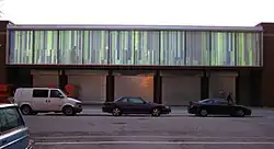 The Hyde Park Art Center's current building was designed by internationally recognized Chicago architect Douglas Garofalo of Garofalo Architects.[3] The new building was converted from an old Army warehouse leased indefinitely to HPAC by the University of Chicago for $1 a year. The total budget for the project was $3 million.[4] Garofalo "was selected to design a building that would highlight accessibility between artists and the public, transparency of the process of art making and exhibiting, and encourage experimentation with technology and concepts."[5] Two of the building's most notable architectural features function to both problematize and undermine the institutionalized boundaries, both tangible and intangible, that often exists between art organizations and the public: the first floor of the building includes "five metal garage-style doors that open up to the main gallery from the sidewalk,"[5] thus extending the gallery space into the street and allowing the public to enter the Art Center easily and at will; and the second floor features "a 10x80 foot glass facade ... outfitted with a system of high range projectors, computers, scrims and screens used primarily to show large-scale digital artworks,"[5] that can be viewed from both inside and outside the Art Center.