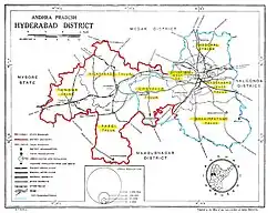 Hyderabad district was formed in 1948 after Operation Polo by merging Atraf-a-Balda District and Baghat District. Baghat was previously a Taluk in Atraf-e-Balda District, and was made a separate district in 1931–34 under the subedar of Medak division. After formation of Andhra Pradesh by merging Telugu speaking of Hyderabad state in 1956 Hyderabad district boundary was altered Tandur Taluka which is Telugu speaking region of Gulbarga district was merged in Hyderabad district and Parigi Taluka of Mahabubnagar district and Vikarabad Taluka of Medak District also merged in Hyderabad district.[3] In 1978 Hyderabad district was later split into Hyderabad Urban District and Hyderabad Rural District. Hyderabad Urban District was made by 4 Talukas are Charminar, Golkonda, Mushirabad and Secunderabad Talukas. Hyderabad rural district was later renamed as Ranga Reddy District.[4] Hyderabad Urban district subdivided in 16 Mandals in 1985 and consist of 2 Revenue division[5][6]