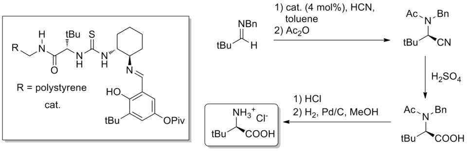 Aside from total synthesis, hydrogen-bond catalysis has been applied to the bulk synthesis of difficult-to-access chiral small molecules. An example is the gram-scale Strecker synthesis of unnatural amino acids using thiourea catalysis, reported in the journal Nature in 2009.[32] The catalyst, whether polymer-bound or homogeneous, is derived from natural tert-leucine and can catalyze (4 mol% catalyst loading) the formation of the Strecker product from benzhydryl amines and aqueous HCN. Hydrolysis of the nitrile and deprotections produces pure unnatural tert-leucine in 84% overall yield and 99% ee.