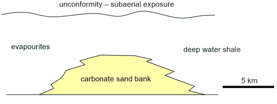 MVT deposits petrogenetic model in general - Carbonate sand banks deposited on a shallow tropical marine platform separated very shallow water evaporite basins (landward) and deeper water muds (seaward).