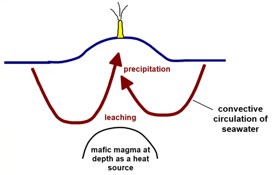 The origin of modern seafloor smokers and ancient volcanogenic massive sulfide deposits: mafic magma at depth (perhaps a few kilometers beneath the surface) acts as a heat source, causing convective circulation of seawater through the oceanic crust.