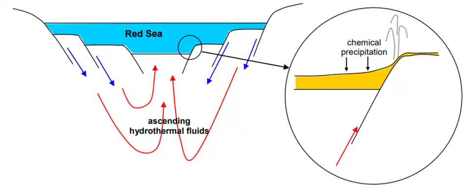 Model for the origin of the Red Sea sulfide deposits. Cold seawater (blue arrows) enters the seafloor via deep-seated fractures. As it descends, it heats up and leaches silicon, metals and other solutes from the seafloor basalts.