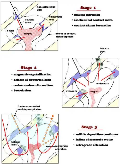 Skarn formation, as illustrated in the figure on the right, can be explained in three stages:[26]