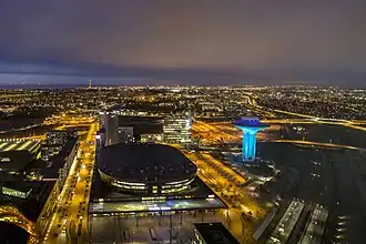 It is Malmö's newest water tower, and its design the result of the winning proposal in an architectural competition.[1] The proposal called "Drabant" was carried out by Kjessler & Mannerstråle from Stockholm. Its construction cost was 8.6 million SEK.[2] Hyllie Water Tower, which is by the Øresundståg railway line and one of the first things which can be seen after entering Sweden from Denmark, is a popular Malmö symbol and is lit blue at night, or other colours for special occasions.[3] The ground level is about 21 metres (69 ft) above sea level.[2]
