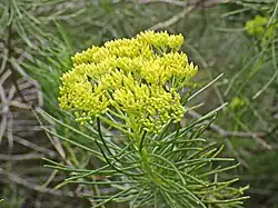 This slender and single branched shrub grows up to 1.5 m (4.9 ft) tall.[4] The stem splits into a few sparse branches from about halfway up the plant.[5] The small thread-like leaves roll outward and downward.[4]