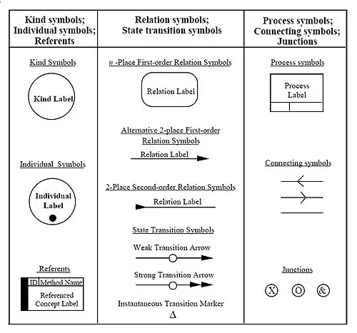 Some of the key terms in IDEF5 and the basic IDEF5 Schematic Language Symbols, see figure.:[1]