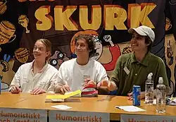 I Just Want To Be Cool signing their book Skurkarnas skurk at the Gothenburg Book Fair in 2023. (From left: Joel Adolphson, Emil Beer, Victor Beer)