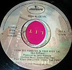"I Can See Forever in Your Eyes" was first released on McEntire's third studio album titled Feel the Fire.[1] In October 1980, "I Can See Forever in Your Eyes" was released as a single on PolyGram/Mercury Records. It was issued as a 7" vinyl single and was backed with a cover of "A Poor Man's Roses (Or a Rich Man's Gold)" on the B-side. It was the second single issued from Feel the Fire.[3] It spent a total of 14 weeks on the Billboard Hot Country Singles chart, eventually reaching number 18 in December 1980. It became McEntire's fourth top 20 single in her career.[4] It also became her fourth single release to chart on the RPM Country Tracks chart in Canada, climbing to number 33.[5]