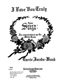 Carrie Jacobs-Bond began to write songs in 1894 to supplement the income of her husband, Frank Bond.[1] When he died in 1895, she returned briefly to her hometown of Janesville, Wisconsin, where "I Love You Truly" was written.[2] She then moved to Chicago where she painted china and rented out rooms to make ends meet.[1] There she continued to write songs and eventually sought to publish them herself. With the encouragement and assistance of friends, including a loan from contralto Jessie Bartlett Davis, in 1901 she published a sheet music collection of her compositions called Seven Songs as Unpretentious as the Wild Rose, one of which was "I Love You Truly".[1] She published it again as a separate song in 1906, at the same time correcting an oversight and filing for copyright. It sold over a million copies,[3] one of the earliest songs composed by a woman to achieve that distinction.[a] Jacobs-Bond was invited to sing at the White House by Presidents Theodore Roosevelt, Warren G. Harding, and Calvin Coolidge, and sang "I Love You Truly" each time.[3]