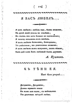 "I Loved You" (Russian: Я вас любил, Ya vas lyubíl) is a poem by Alexander Pushkin written in 1829 and published in 1830. It has been described as "the quintessential statement of the theme of lost love" in Russian poetry,[1] and an example of Pushkin's respectful attitude towards women.[2]