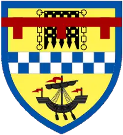 Or a fess chequy Azure and Argent between a portcullis with chains in chief and a lymphad sails furled oars in action Sable flagged Gules in base all within a bordure Azure a label of three points Gules.
