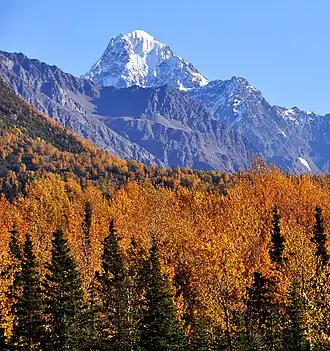 Ice Cream Cone Mountain is an 8,675-foot-elevation (2,644-meter) mountain summit located 22 miles (35 km) east of Palmer, in the northern Chugach Mountains of Alaska. This peak is visible from the Glenn Highway near Mile 70 west of Kings Mountain. Precipitation runoff from the mountain's north slope drains into Carpenter Creek, a tributary of the Matanuska River, whereas the south slope drains into Metal Creek, a tributary of the Knik River. Topographic relief is significant as the summit rises 5,200 feet (1,585 meters) above Metal Creek in 1.5 mile (2.4 km) and 5,675 feet (1,730 meters) above Carpenter Creek in 1.9 mile (3 km). The first ascent of the summit was made on July 3, 1967, by David P. Johnston, John Samuelson, and Hans Van der Laan via the Northeast Ridge.[4][5] This mountain's local descriptive toponym has not been officially adopted by the United States Board on Geographic Names, so it is only marked as "8675" on USGS maps. Some climbers in Anchorage call this peak the "Sky Buster" which was the name applied by mountaineer Vin Hoeman.[6]