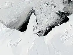 The Filchner-Ronne Ice Shelf The ice mélange at the boundary of the ice shelf has sufficient strength to trap large tabular ice-shelf fragments for several decades before the fragments eventually become icebergs. This mélange tends to deform coherently in response to the ice shelf flow and the deformation of sea ice within the rifts suggests that the sea ice binds together large tabular ice-shelf fragments. The motion of the tabular fragments is a rigid body rotation about a vertical axis that is driven by velocity shear within the mélange. The role of the rift-filling mélange may be to bind tabular ice-shelf fragments to the main ice shelf before they calve. This suggests two possible mechanisms by which climate could influence tabular iceberg calving. First, non-uniform distributions in oceanic and atmospheric temperature may determine where the mélange melts and, thus, the location of the iceberg-calving margin. Second, melting or weakening of ice mélange as a consequence of climate change could trigger a sudden or widespread release of tabular icebergs and lead to rapid ice-shelf disintegration. Ice-shelf rifting, a long-term process that culminates in tabular iceberg release, is strongly influenced by sea ice and other types of ice, which fill the rift. The eventual detachment of these fragments as icebergs thus appears to be determined in part by the dynamics of the mélange which fills rifts.[9]