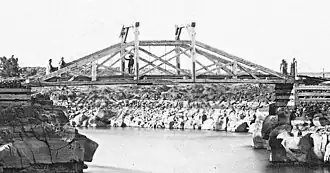 Soon, the Utah and Northern Railway (U&NR) was built, stretching north from Utah through Eagle Rock and crossing the Snake River at the same narrow gorge as Taylor's bridge. The railway would eventually connect to the large new copper mines at Butte, Montana. The U&NR had the backing of robber baron Jay Gould, as Union Pacific Railroad had purchased it a few years prior.[9] Grading crews reached Eagle Rock in late 1878, and by early 1879, a wild camp-town with dozens of tents and shanties had moved to Eagle Rock with a collection of saloons, dance halls, and gambling halls. The railroad company had 16 locomotives and 300 train cars working between Logan, Utah and the once-quiet stage stop. A new iron railroad bridge was fabricated in Athens, Pennsylvania at a cost of $30,000 and shipped by rail to the site, where it was erected in April and May 1879.[10] The bridge was 800 feet (240 m) long and had two spans, with an island in the center. The camp-town moved on, but Eagle Rock now had regular train service and several U&NR buildings, shops, and facilities which expanded and transformed the town.