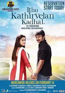 Ithu Kathirvelan Kadhal (transl. This Is Kathirvelan's Love) is a 2014 Indian Tamil-language romantic comedy drama film written and directed by S. R. Prabhakaran starring Udhayanidhi Stalin and Nayanthara.[1] Santhanam and Sunder Ramu play important roles in the film while Saranya Ponvannan and Chaya Singh play supporting roles.[2] Produced by Red Giant Films, the film has cinematography by Balasubramanium and art direction by V Selvaraj.[3]