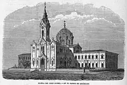 The Iglesia de Nuestra Señora del Buen Suceso, commonly known as Iglesia del Buen Suceso was a church of Madrid that delimited the eastern part of the Puerta del Sol (Madrid).[1] The church comes from a remodeling of the Hospital Real de la Corte (Royal Hospital of the Court) (built in 1483). Was doing functions of church and hospital since 1590. Its lonja was meeting place for several centuries. The church's clock would be important during this period until it was installed one of better performance on the Real Casa de Correos.[2] Its demolition coincided with the Confiscation of Mendizábal that left space for the later expansion that was done for the Puerta del Sol.