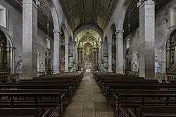 The nave of the church is divided in three aisles by arches built during the Mannerist repair works following the 1531 earthquake. After the 1755 earthquake the interior of the church was re-decorated in Baroque style, with gilded columns decorated in talha dourada (a typical Portuguese technique to decorate woodwork with gold leaves) in the choir and a beautiful altarpiece. The painting of the main altarpiece is a work by Pedro Alexandrino.