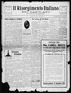 ![]() The front page for the September 9, 1922 issue of "Il Risorgimento Italiano nel Maryland". | |