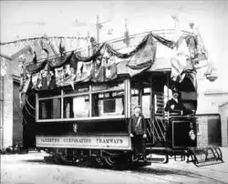 The first public tram ran on 16 May 1903.[6][4] In 1903 tram stops and fares were fixed (1d anywhere, except Station Road to Bath street which was 1/2d.) An illuminated tram was in use for Christmas 1909 and again at the celebrations for the coronation of King George V in 1911.[7]